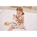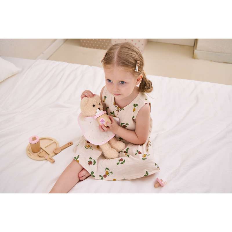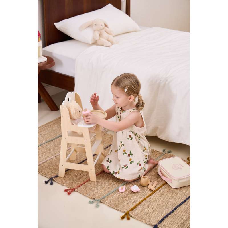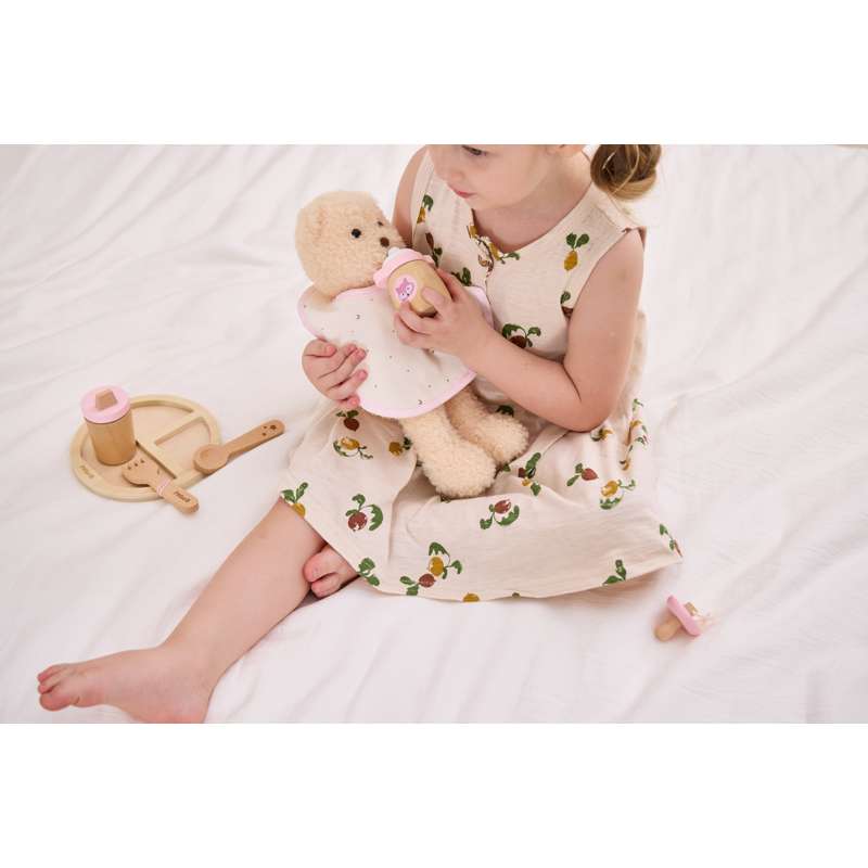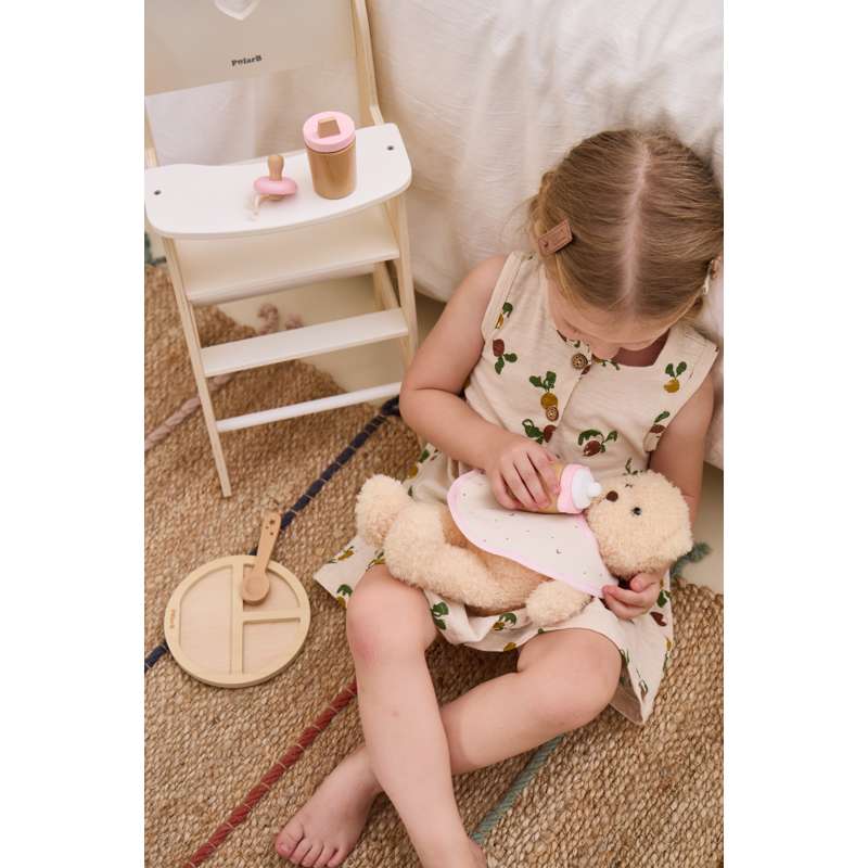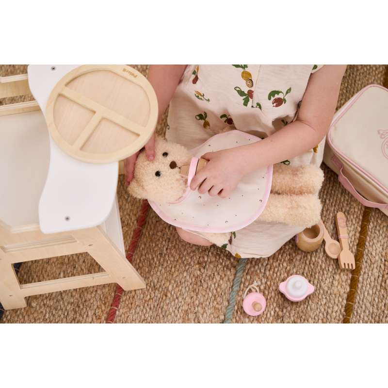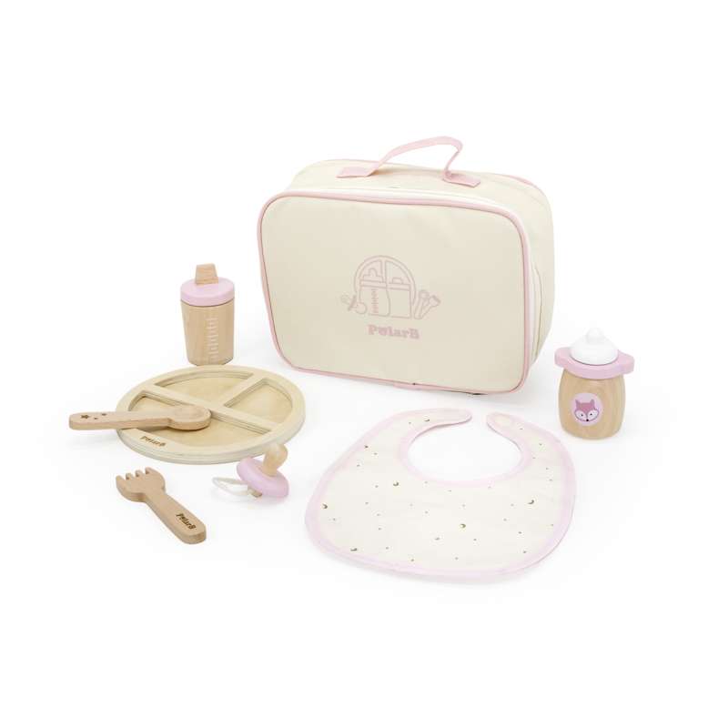 Sættet består af en hagesmæk, en ske, en gaffel, en sut, en tallerken, en drikkedunk og en sutteflaske – og det hele kommer samlet i en lille, praktisk taske. Perfekt til rolleleg, der styrker empati, omsorg og ansvar.