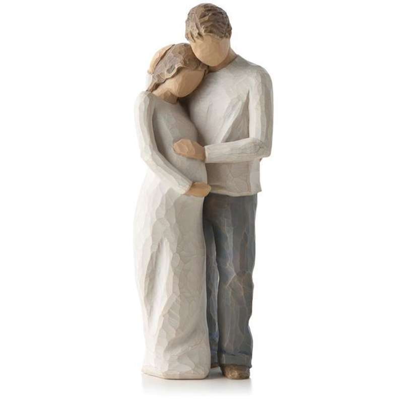 Krásná figurka Smuk Home od Willow Tree, která zobrazuje muže a těhotnou ženu v něžném a láskyplném objetí a napjatém očekávání.