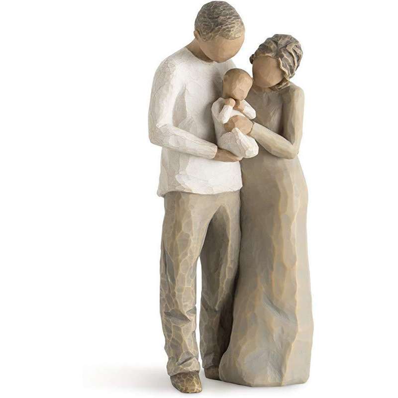 Krásná figurka We Are Three od Willow Tree, která zobrazuje muže a ženu v milostném objetí s jejich malým dítětem.