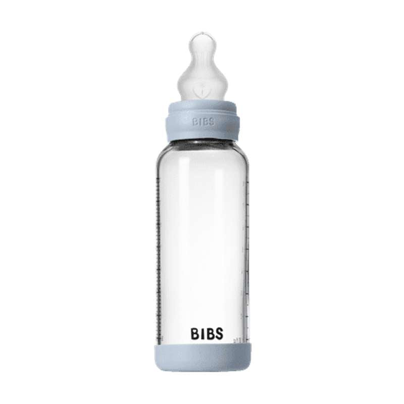 BIBS Flasche - Sauger-Set - Glas - Silikon/Mittel Fluss/Rund - 240 ml. - Baby Blau
