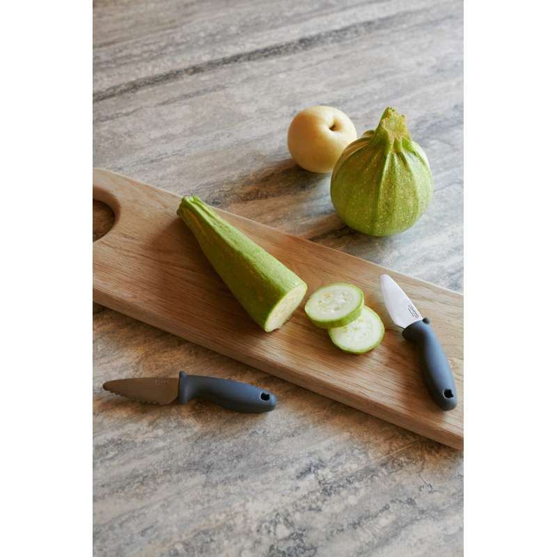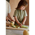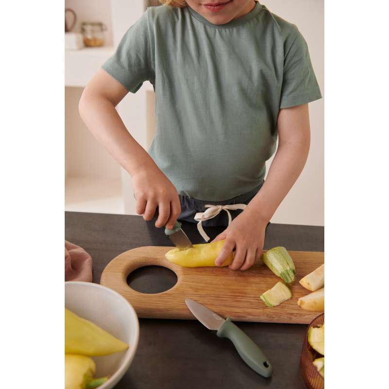 Mit den feinen Kochmessern, die im Set zu 2 kommen, können die Kinder (fast) gleichberechtigt mit Mama und Papa in der Küche helfen. Die Messer sind so gestaltet, dass die Schneide leicht durch Obst und Gemüse geht – aber nicht durch Kinderfinger.
