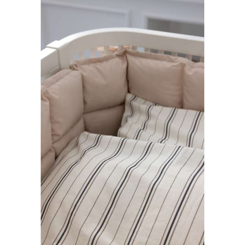Percale ist et feines, dicht gewebtes Material mit einer matten Oberfläche und einer „knackigen“ Weichheit, die mit jeder Wäsche noch weicher wird. Das Design, Cream Stripe, sind klassische Streifen, die auf einem hellbeigen Grund gedruckt sind, und es ist unisex, sodass es leicht für mehrere Geschwister verwendet werden kann.