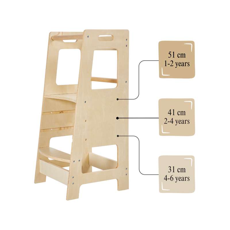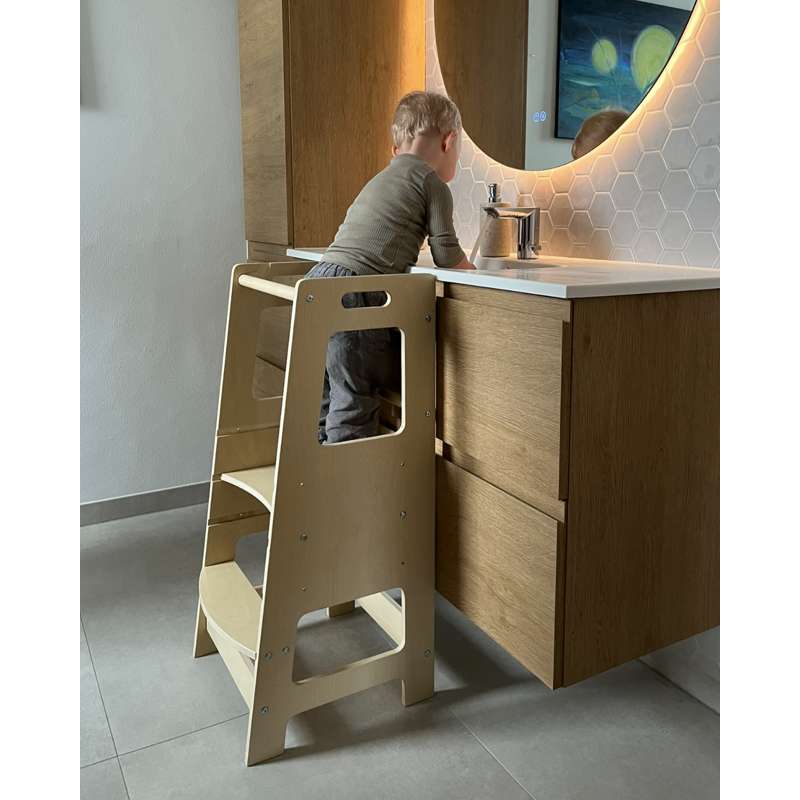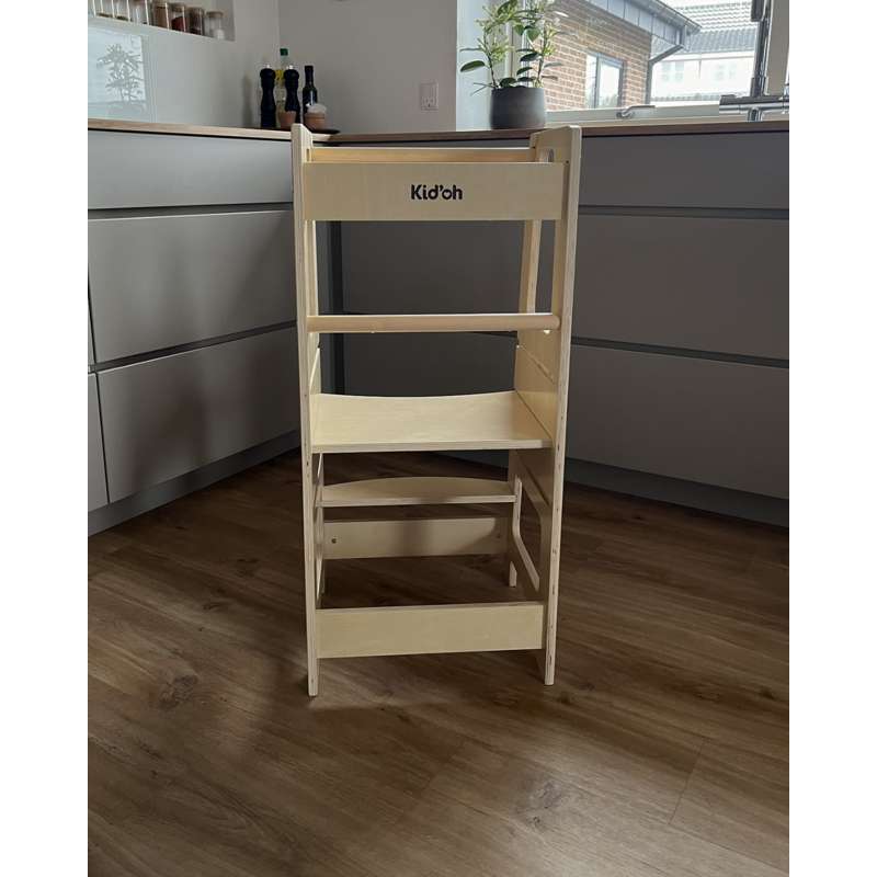 Kid'oh Torre de aprendizaje en madera natural es et un mueble multifuncional, diseñado para proporcionar a los niños una plataforma segura para participar en actividades diarias en la cocina. La torre de aprendizaje está hecha de madera sólida y se puede ajustar en altura para seguir el desarrollo del niño. Es ideal para fomentar la independencia y las habilidades motoras de los niños, ya que les permite participar en actividades como cocinar o lavarse las manos. Et una opción elegante y práctica para cualquier hogar con niños pequeños.