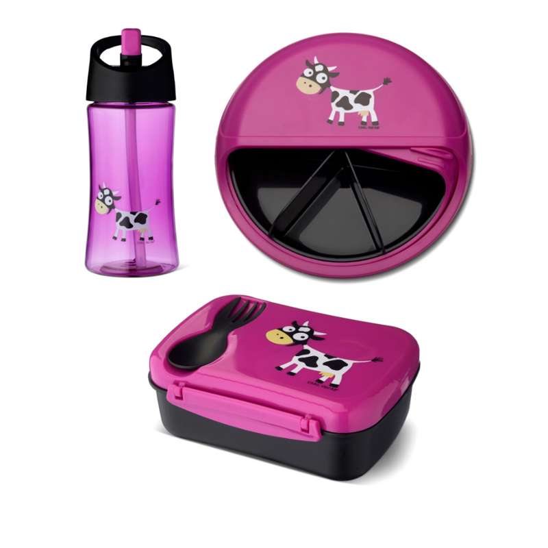 Lapsille juomapullo, jossa on pillitoiminto Carl Oscar. Kauniissa lilassa värissä, jossa on söpön lehmän kuva....