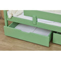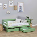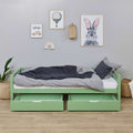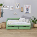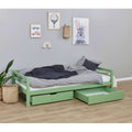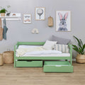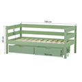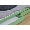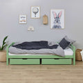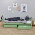 Käytännöllinen Hoppekidsin laatikosto vaaleanvihreänä pyörillä sohva- ja kerrossängyille. Tätä laatikostoa voidaan käyttää sekä vaatteiden, lelujen, peittojen tai ihan muun säilyttämiseen.