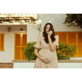 Mekko on lyhyt, v-pääntiellä ja lyhyillä hihoilla. Rintakehän alla on rypytysdetaljeita ja pitsiä helman ja hihojen reunassa.