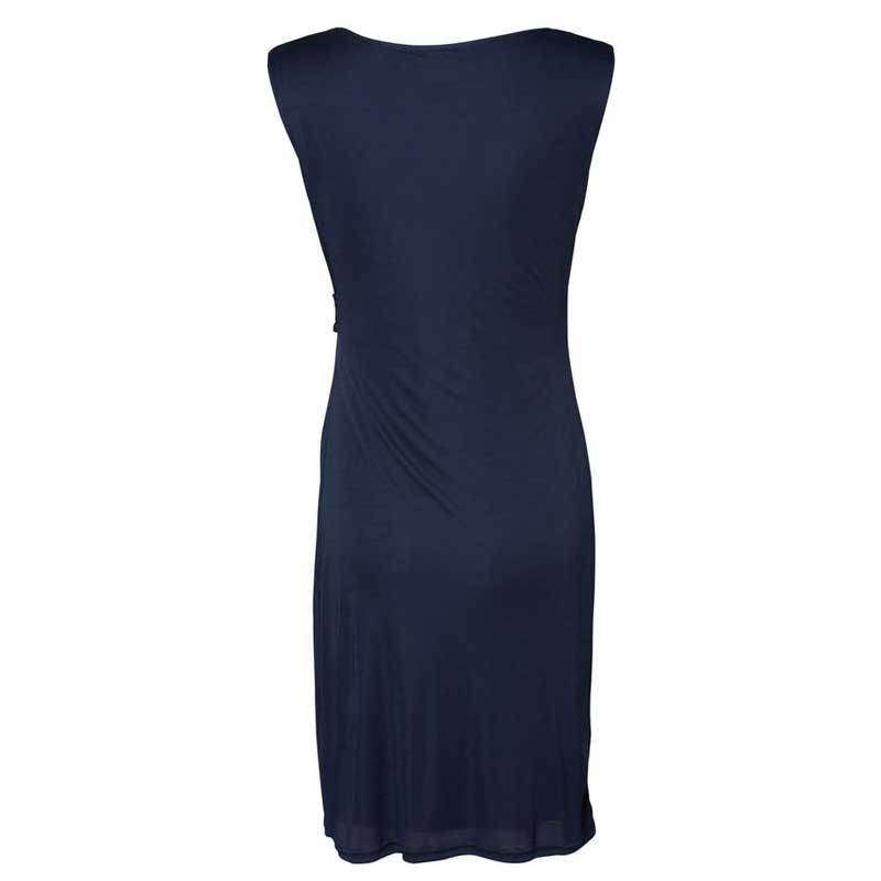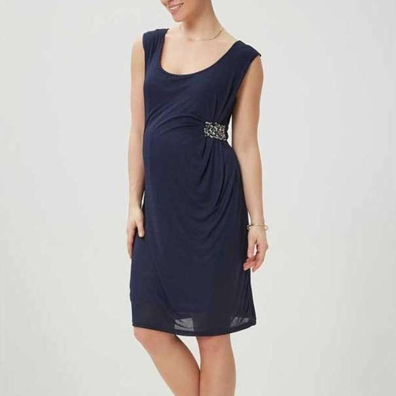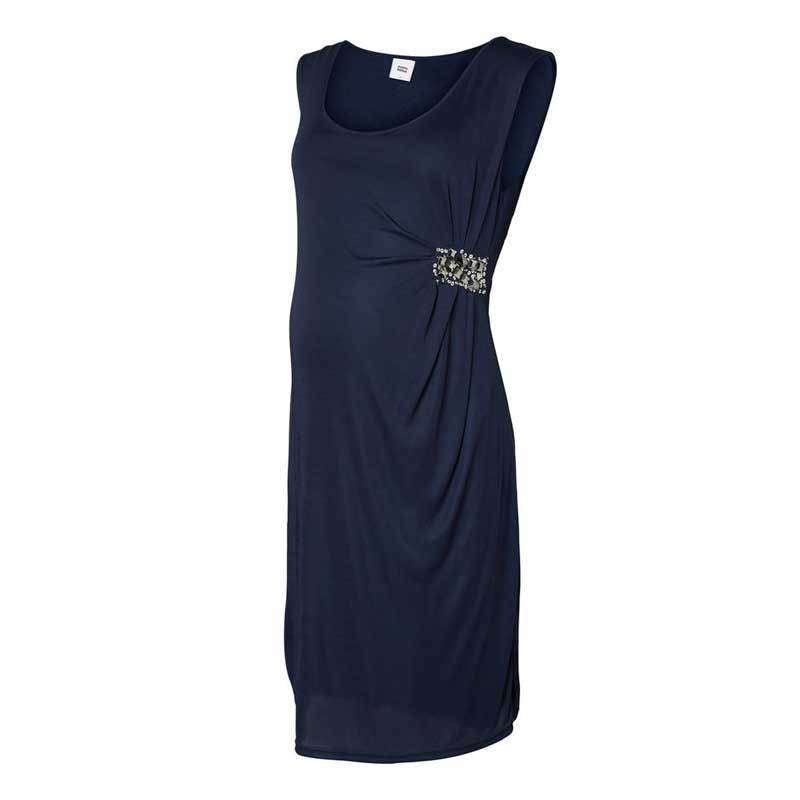 Kaunis elegant mekko ilman hihoja, pyöreällä kaula-aukolla ja kauniilla kiviallas yksityiskohdilla, samalla kun siinä on tilaa kasvavalle vatsalle.