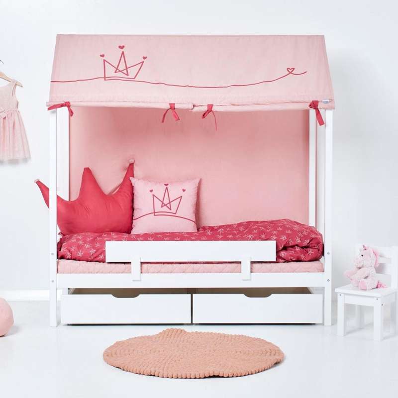 A textil tető 100% Oeko-Tex tanúsítvánnyal rendelkező pamutból készült, és 30 fokon mosható. A tető a PRINCESS univerzumból való, szép világos rózsaszín színnel és et egyszerű dizájnnal, amelyen egy nagy szép korona található. Az univerzumban sok ízléses textil található, amelyeket együtt vagy külön-külön is lehet használni. Az egyszerű dizájn miatt a textíliák a legtöbb gyerekszobához illeszkednek.