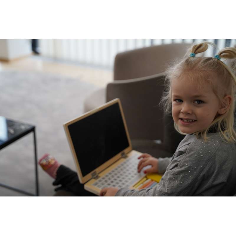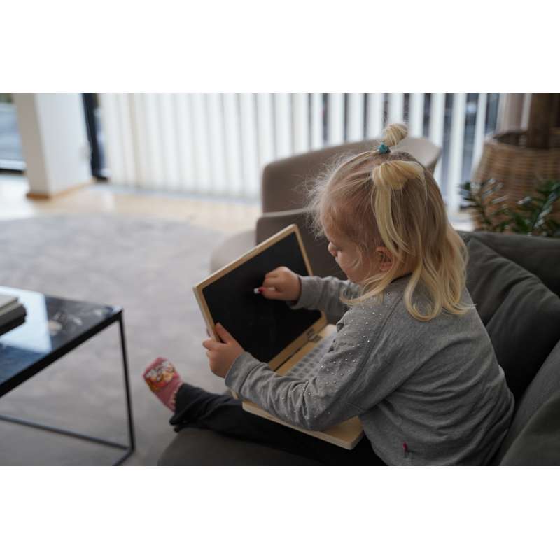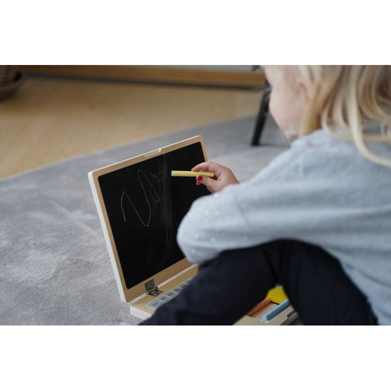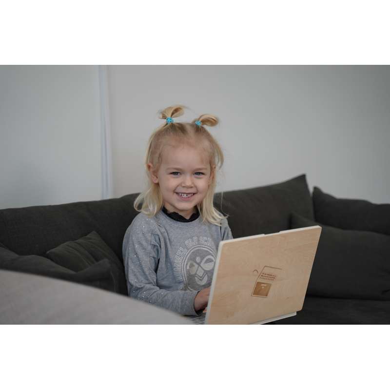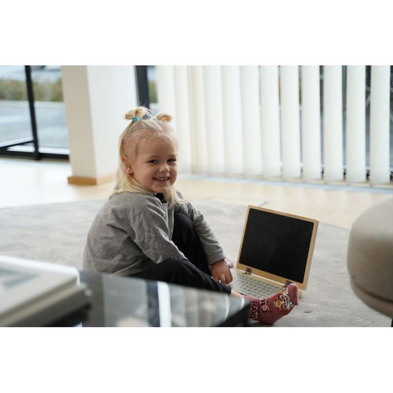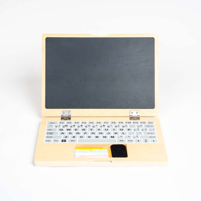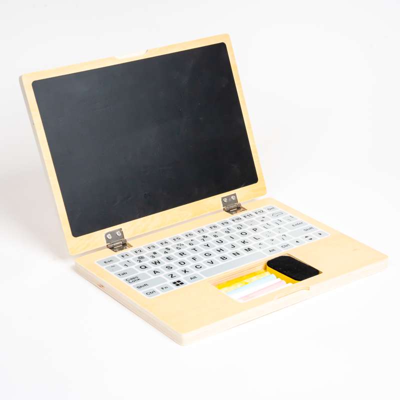 Bel laptop in legno per i più piccoli. Sullo schermo c'è una lavagna, quindi il bambino può disegnare con il gesso in dotazione.