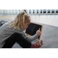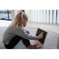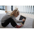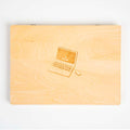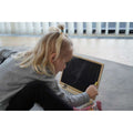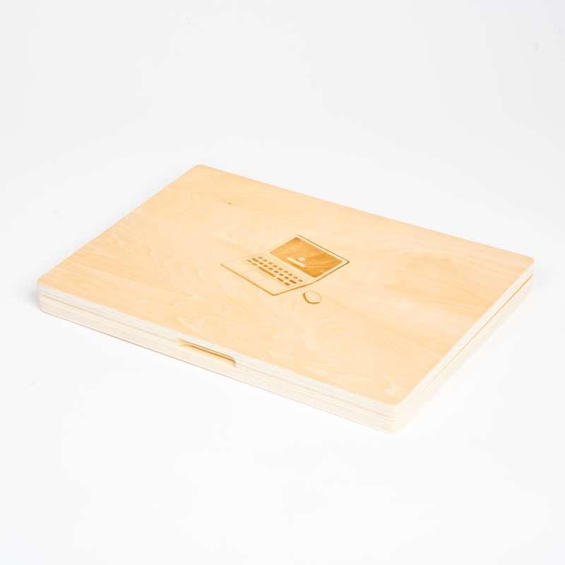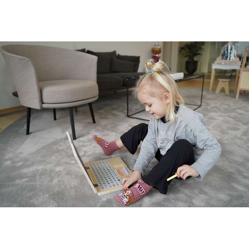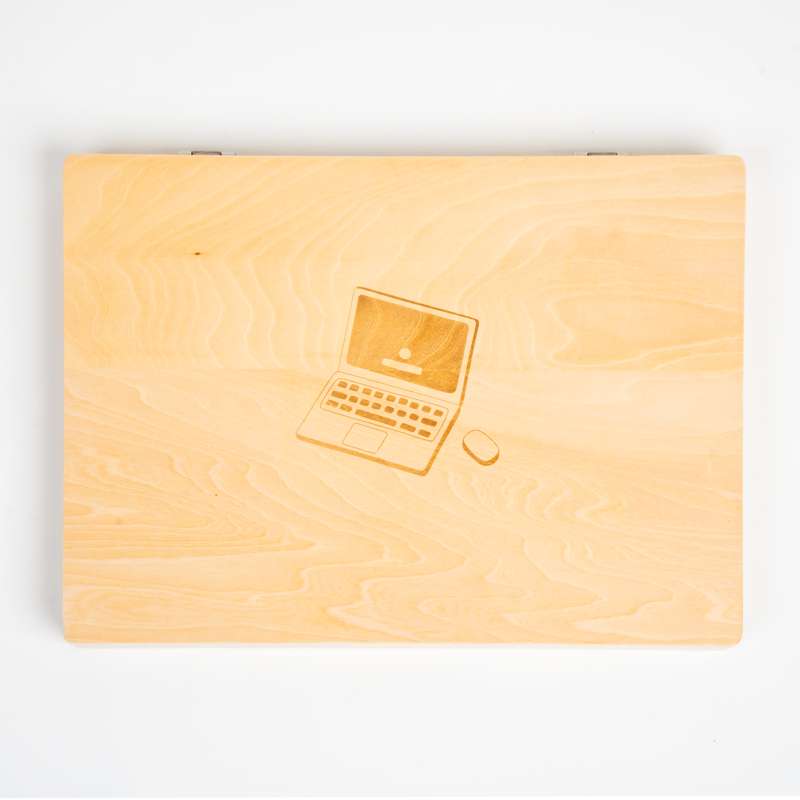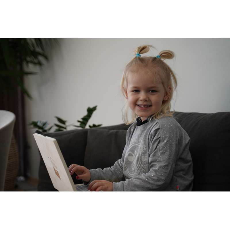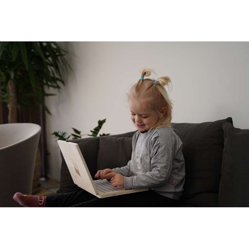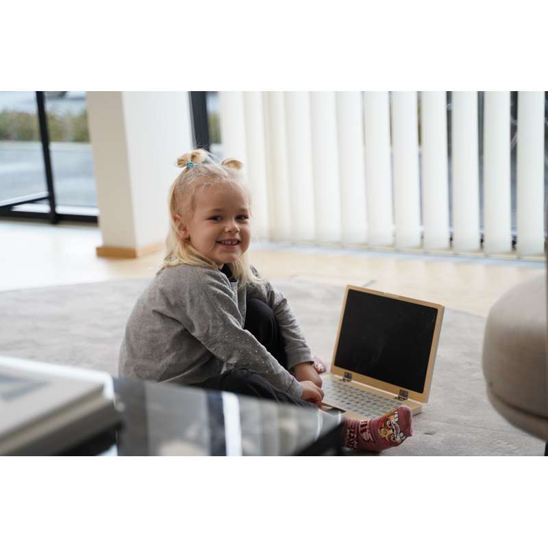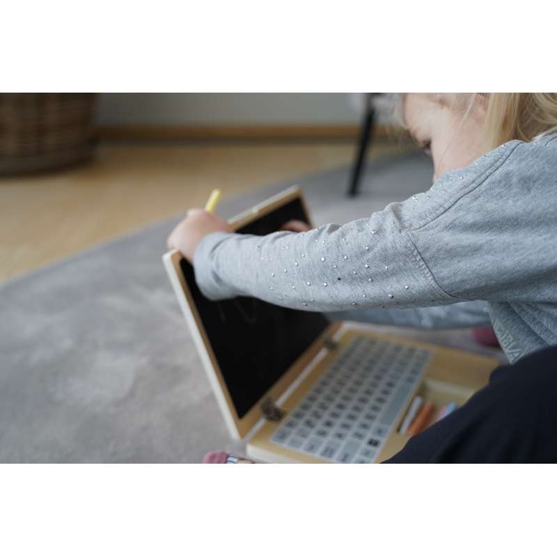 Bel laptop in legno per i più piccoli. Sullo schermo c'è una lavagna, quindi il bambino può disegnare con il gesso in dotazione.