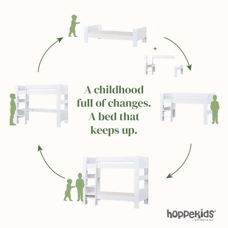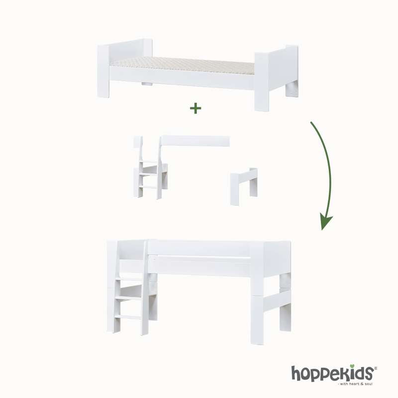 Hoppekids PURE Halfhoogslaper is een onderdeel van het et bedsysteem, wat betekent, dat het bed kan worden omgebouwd tot een ander type bed. Het halfhoge bed bestaat uit een Peuterbed en et module. Je kunt daarom de module verwijderen en het bed als een Peuterbed gebruiken in plaats van. Bij aankoop van modules kan het bed ook worden omgebouwd tot een Hoogslaper (met module artikelnummer: 31-6180-82-09A) en een Stapelbed (met module artikelnummer: 31-6151-82-09A).