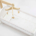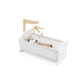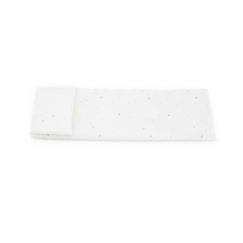 Sengen leveres komplet med en blød pude og en quilt i 100% bomuld – dekoreret med sødt stjerne- og måneprint. Der medfølger også en lille uro, som hænger over sengen og skaber en ekstra hyggelig stemning i børneværelset.