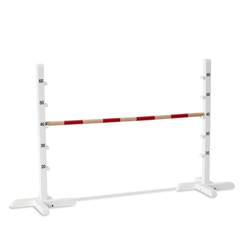 Hestespranget består av tre deler og settes lett sammen. De to sidestolpene er støtte for tverrpinnen, som kan reguleres i høyden. Så kan både små og store minier hoppe med stor suksess over spranget.
