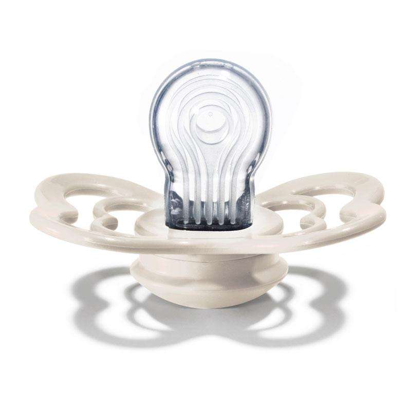 BIBS De Lux jest jedynym modelem w roz. one size. Smoczek jest okrągły, wykonany z silikonu i zalecany dla dzieci w każdym wieku.