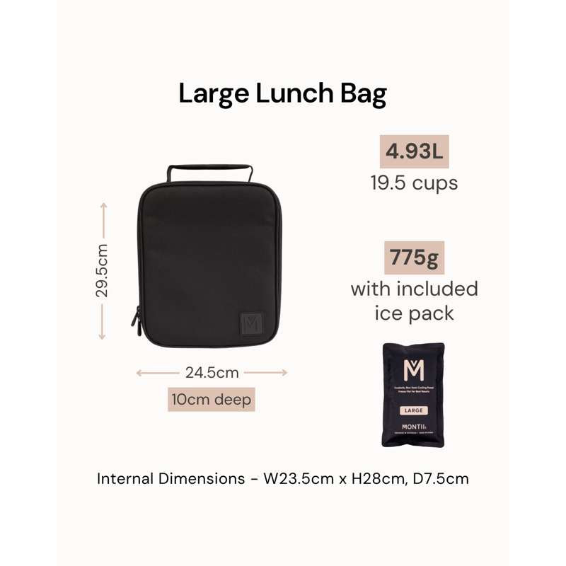 Torba chłodząca ma wyściełany uchwyt i oprócz pojemników na jedzenie ma również miejsce na wkłady chłodzące i akcesoria. Dołączony jest również et MontiiCo 2.0 wkład chłodzący w rozmiarze dużym.