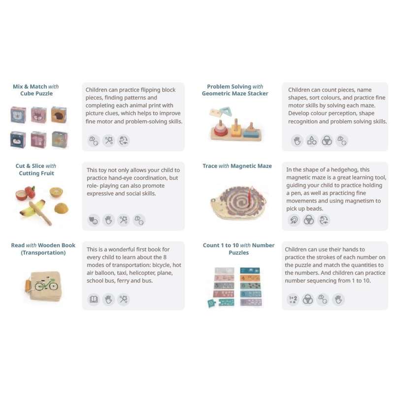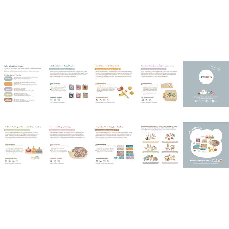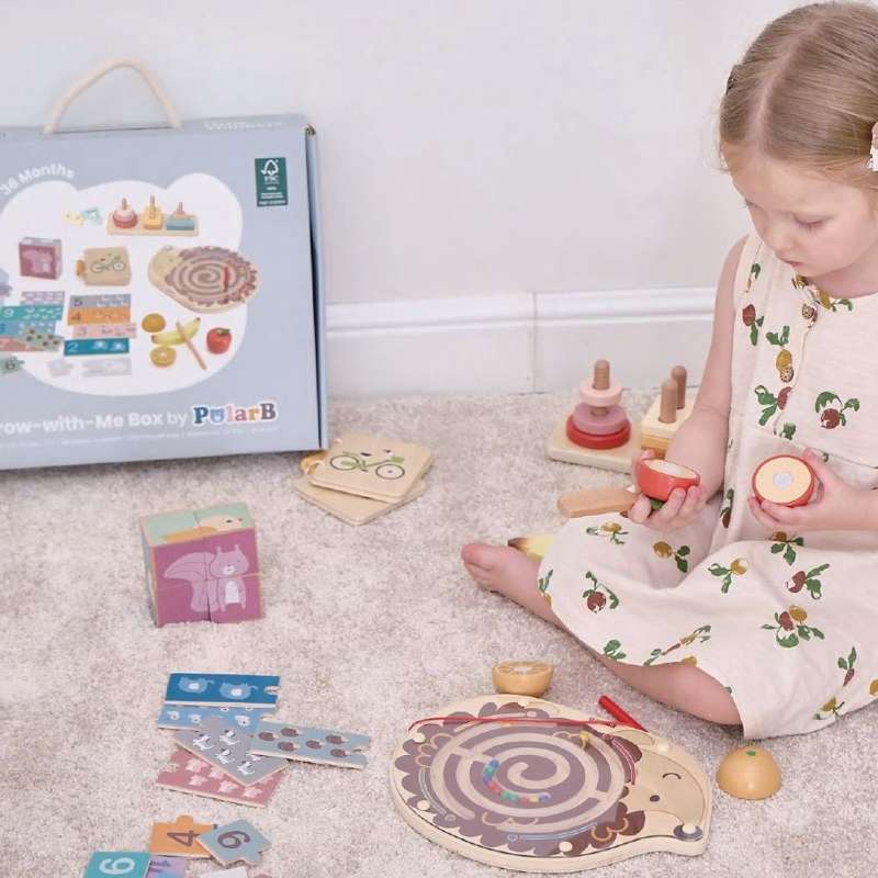 Grow-with-Me boxes support children's learning during important developmental stages with toys that are tailored to their age. They also save parents time and energy by selecting age-appropriate, safe, and educational toys from the market.
