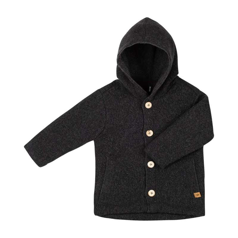 Hooded jacket made from 75% recycled wool, 20% recycled polyamide and 5% other fibers, GRS certified. The densely processed material ensures that little ones stay comfortably warm, even in humid environments.