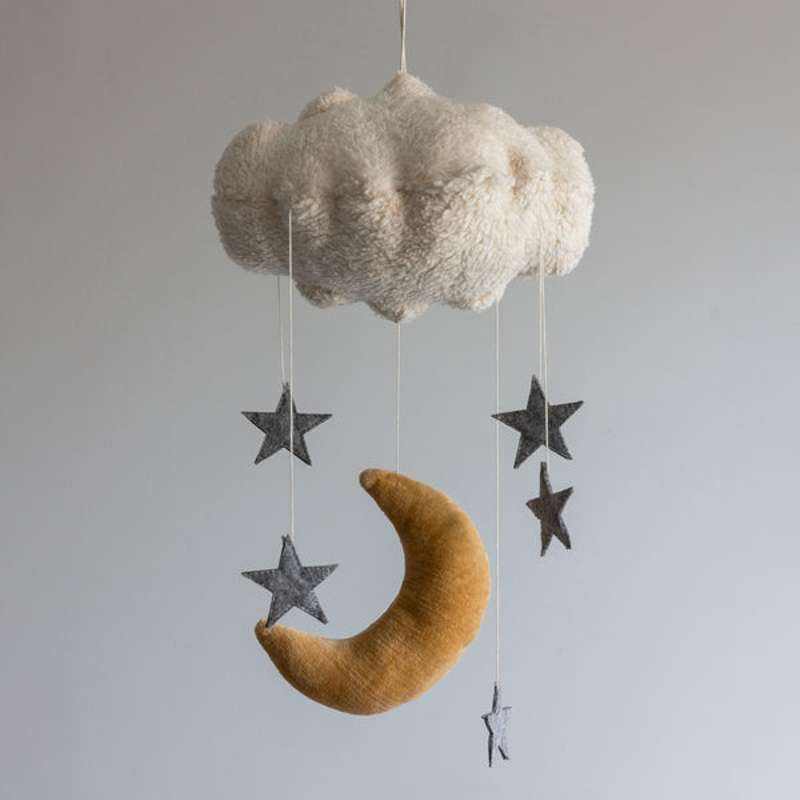 The baby mobile consists of a 20 cm long cloud, from which small velvet stars and a felt moon hang down. It is designed in calm and harmonious colors that match any nursery.