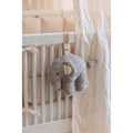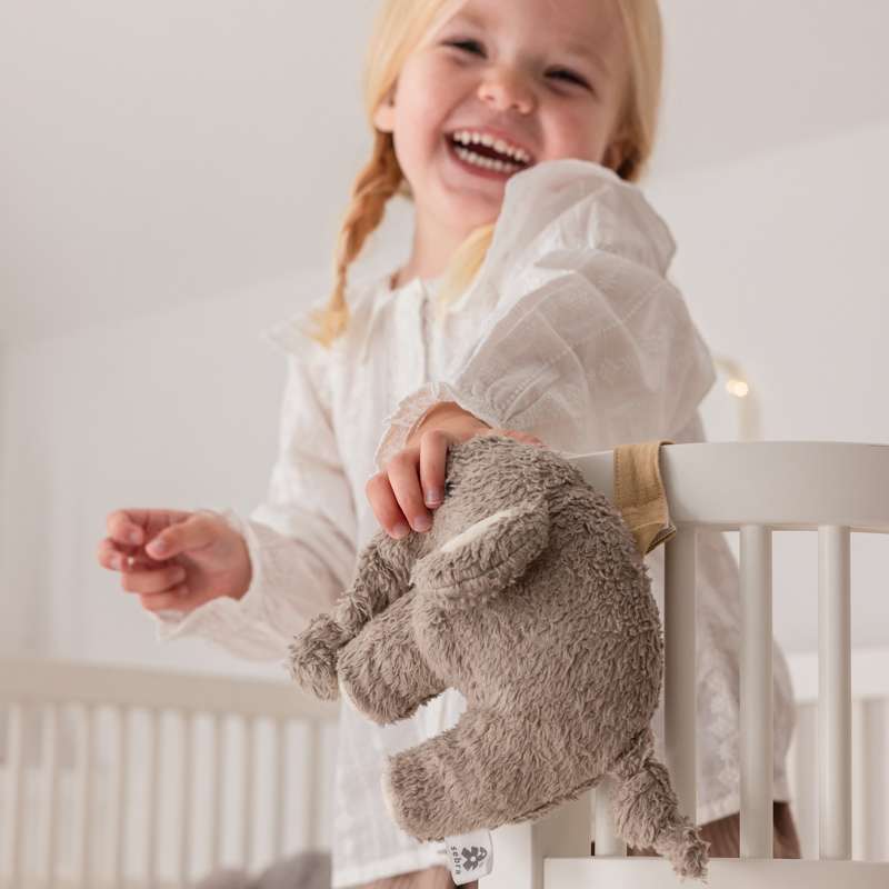Fanto is 15 cm tall and equipped with a practical Velcro strap that makes it easy to attach to the bed, activity stand, car seat, or other places where it can create value. The elephant has soft ears and a knot on its tail that small fingers can fiddle with and find comfort in.