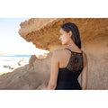 Nas costas, há uma bonita renda que torna o tankini muito feminino e elegante.