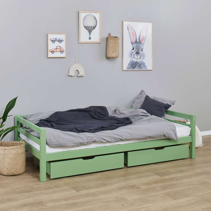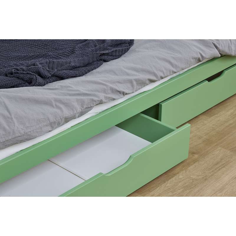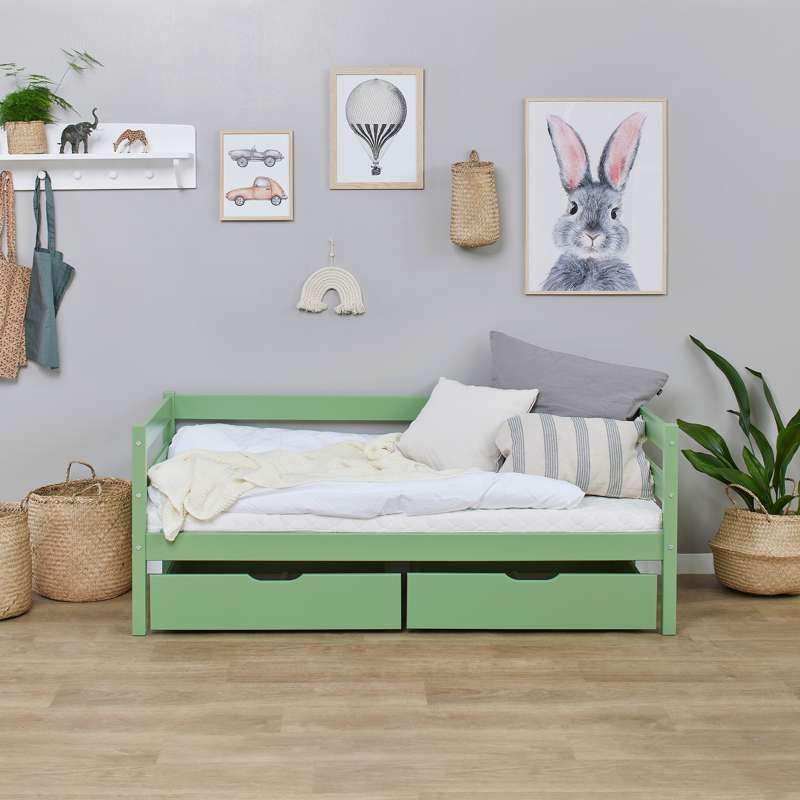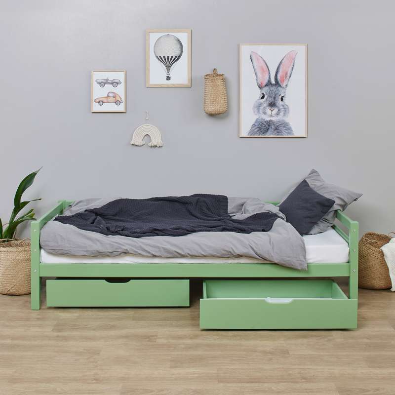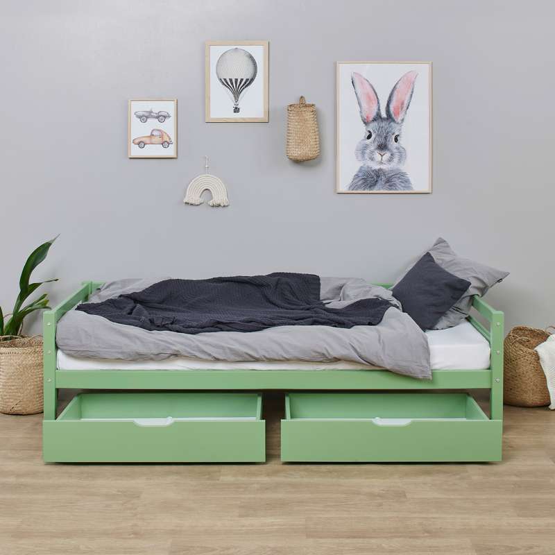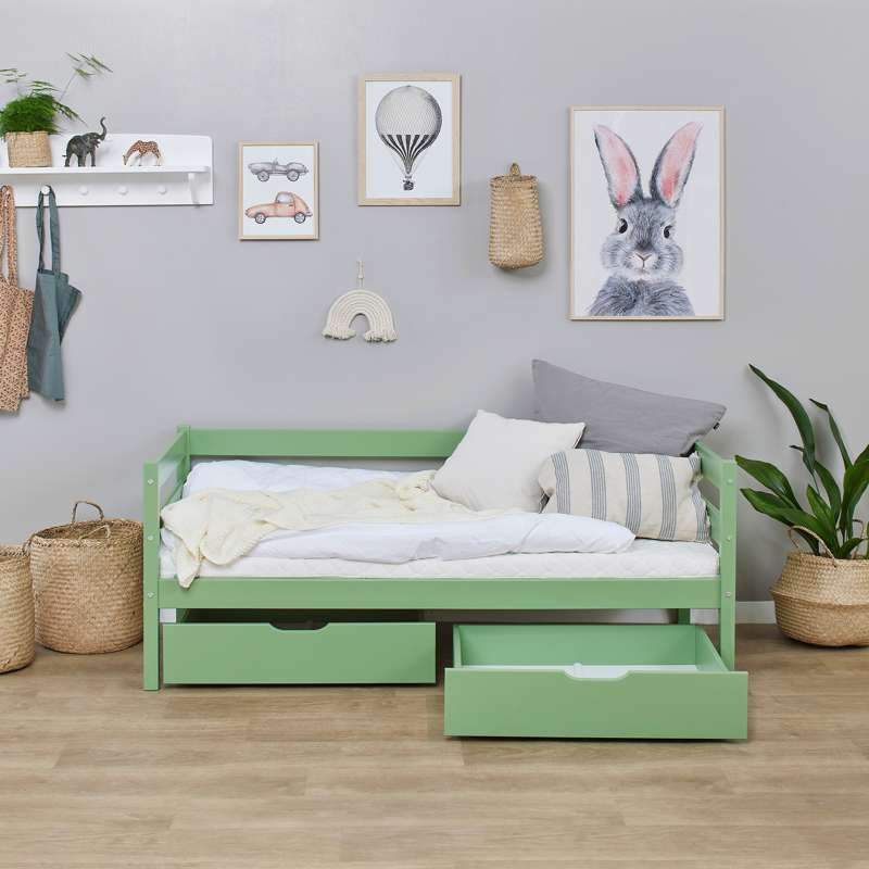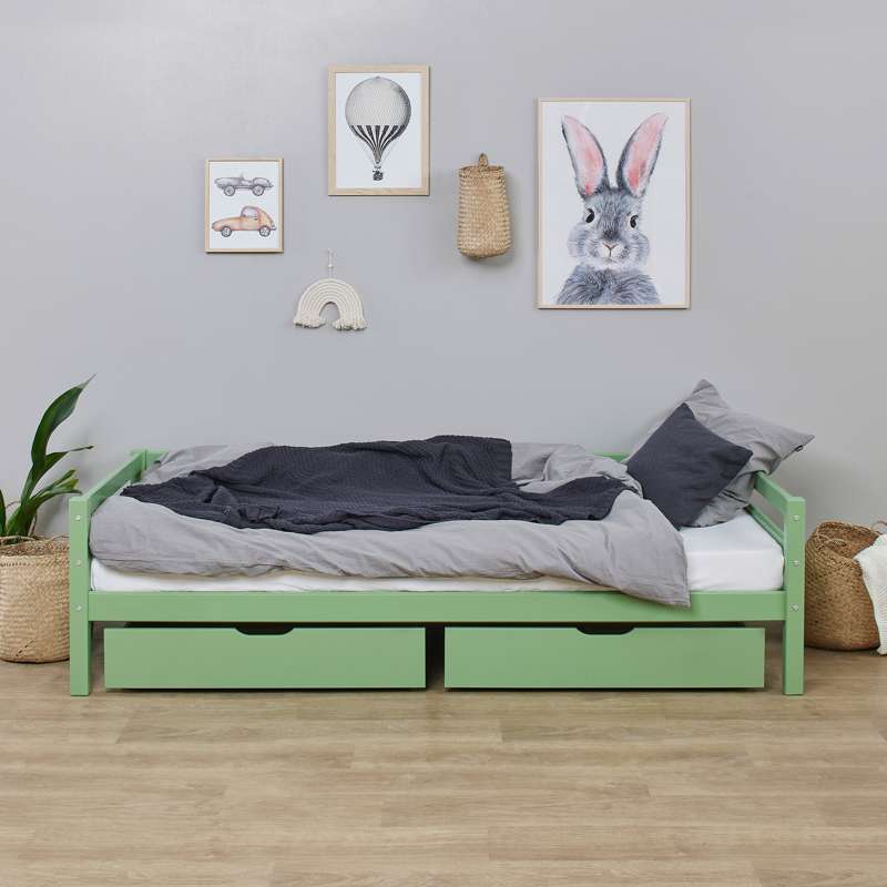 Conjunto de gavetas prático Hoppekids em Pale Green com rodas para sofás e camas de beliche. Este conjunto de gavetas pode ser utilizado tanto para armazenar roupas, brinquedos, cobertores ou qualquer outra coisa.