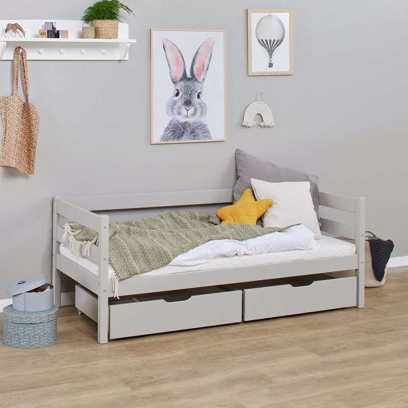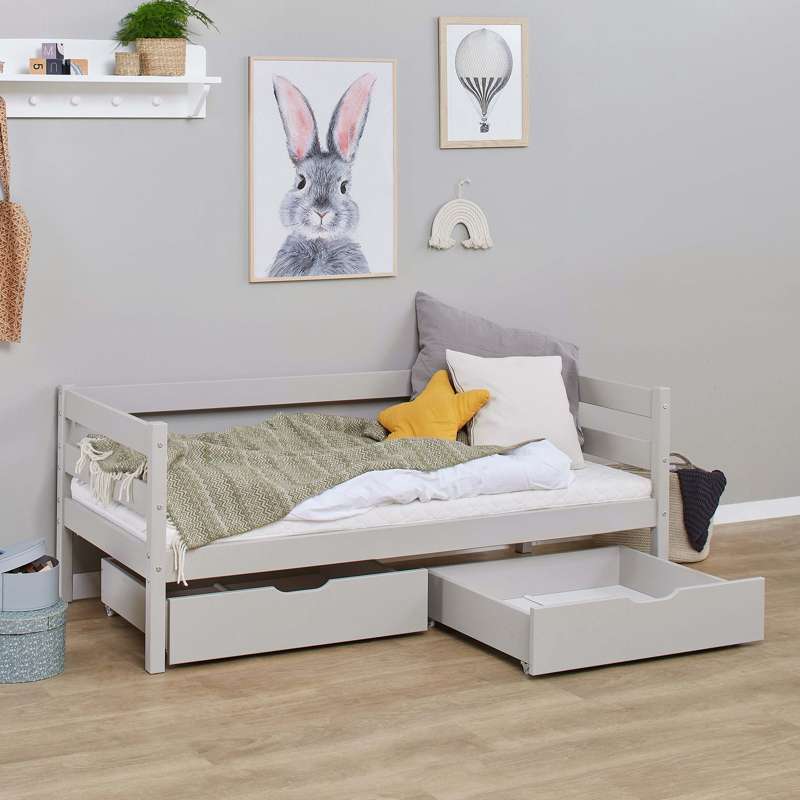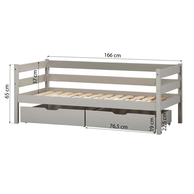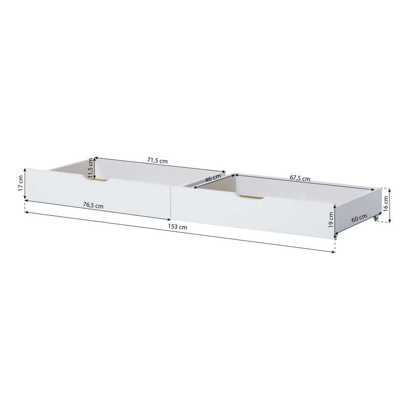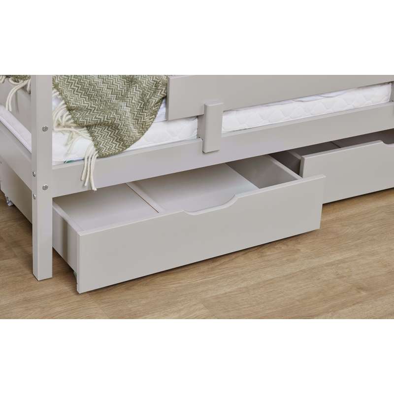 Conjunto de gavetas com duas grandes e práticas gavetas da Hoppekids. As gavetas são perfeitas para armazenar roupa de cama ou brinquedos. Adequadas para camas com dimensão de colchão 70x160 cm. A gaveta é tratada com um verniz à base de água, amigo do ambiente.