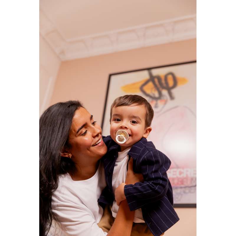 BIBS suzetele din măr. 3 sunt recomandate de la 18 luni în sus. Suzetele măr. 3 sunt disponibile doar din cauciuc natural/latex, cu tetină rotundă, în modelul Culoare.