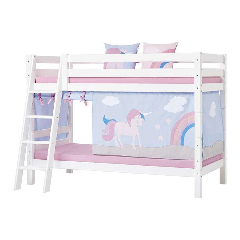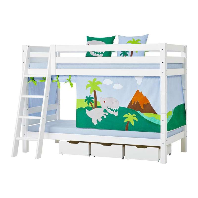 Pat etajat ECO Luxury inteligent și confortabil, de dimensiunea 90x200 cm, cu scară înclinată de la Hoppekids. Patul etajat oferă un spațiu suplimentar pentru dormit, fără a ocupa mai mult loc pe podea. Paturile pot fi, dacă doriți mai târziu, despartite în două paturi. Patul este certificat cu eticheta de mediu Swan, are garanție pe viață și este tratat cu lac ecologic pe bază de apă.