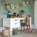 Biroul MAJA de la Hoppekids este et un birou elegant cu un design clasic. Există mult spațiu atât pentru teme, cât și pentru activități creative. Sertarele oferă un spațiu de depozitare generos. Biroul este fabricat din lemn și tratat cu un lac ecologic pe bază de apă, fără substanțe chimice dăunătoare și inutile.