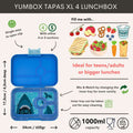 Yumbox Tapas je najväčšia z obedových misiek Yumbox. Tu je dostatok miesta na dosť chlebíkov s ražným chlebom na zasýtenie veľkého tínedžera - alebo samozrejme dospelého. Tapas miska môže byť tiež et dobrou voľbou pre školákov, kde sa obed musí zabaliť spolu s ovocím alebo olovrant.