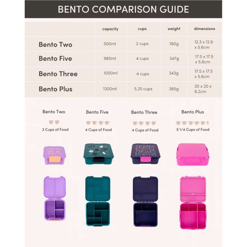 Malica vsebuje 500 ml in je razdeljena na dva prostora ter se zapira s pokrovom, ki ga je enostavno odpreti, tudi za majhne prste. Popolna je za majhno lakoto, bodisi na poti bodisi kot malica za dopoldansko ali popoldansko malico v šoli, vrtcu ali jaslih.
